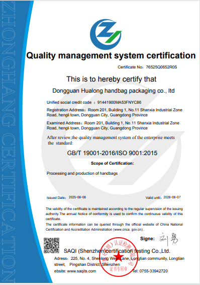 Establecido en 2015,Hualong Handbag Packaging Co., Ltd se ha especializado en la I + D, producción y venta de bolsas de embalaje durante 10 años, incluidas bolsas de regalo, bolsas de compras, bolsas médicas, bolsas de juguetes, bolsas de cosméticos y bolsas de papelería.